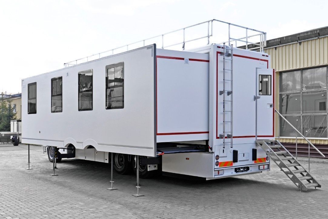 Раздвижной штаб для организации работы и быта гоночной команды. Включает спальные зоны на 6 человек, санузел с душевой, основной зал с подъемными столешницами. Предусмотрен доступ на крышу комплекса, смотровая зона на втором этаже и автономные инженерные системы.